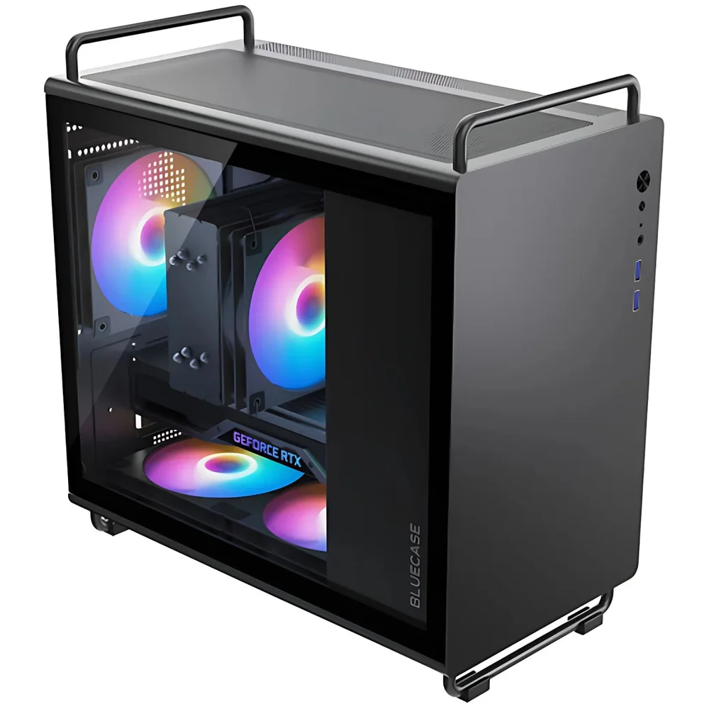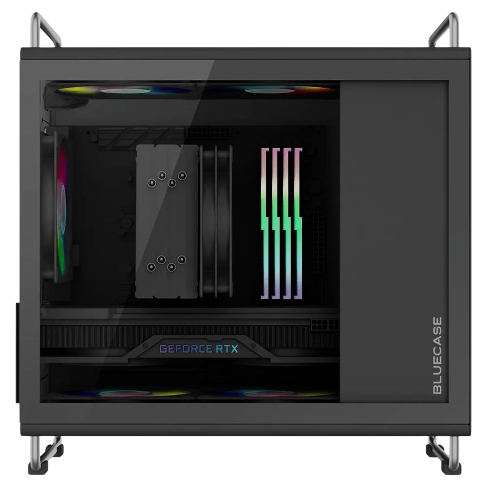 Para resfriamento, conta com suporte para ventoinhas em diversas posições: 2x 120mm superiores, 1x 120mm traseira e 2x 120mm inferiores. Inclui PSU Cover para um acabamento mais organizado e filtros de poeira no painel superior e inferior. O painel frontal possui duas portas USB 3.0, além de botões de power, reset e conexões de áudio. Nessa versão do BG-056 TINY PRO, os 5 Fans de 120mm ARGB já são pré-instalados.
